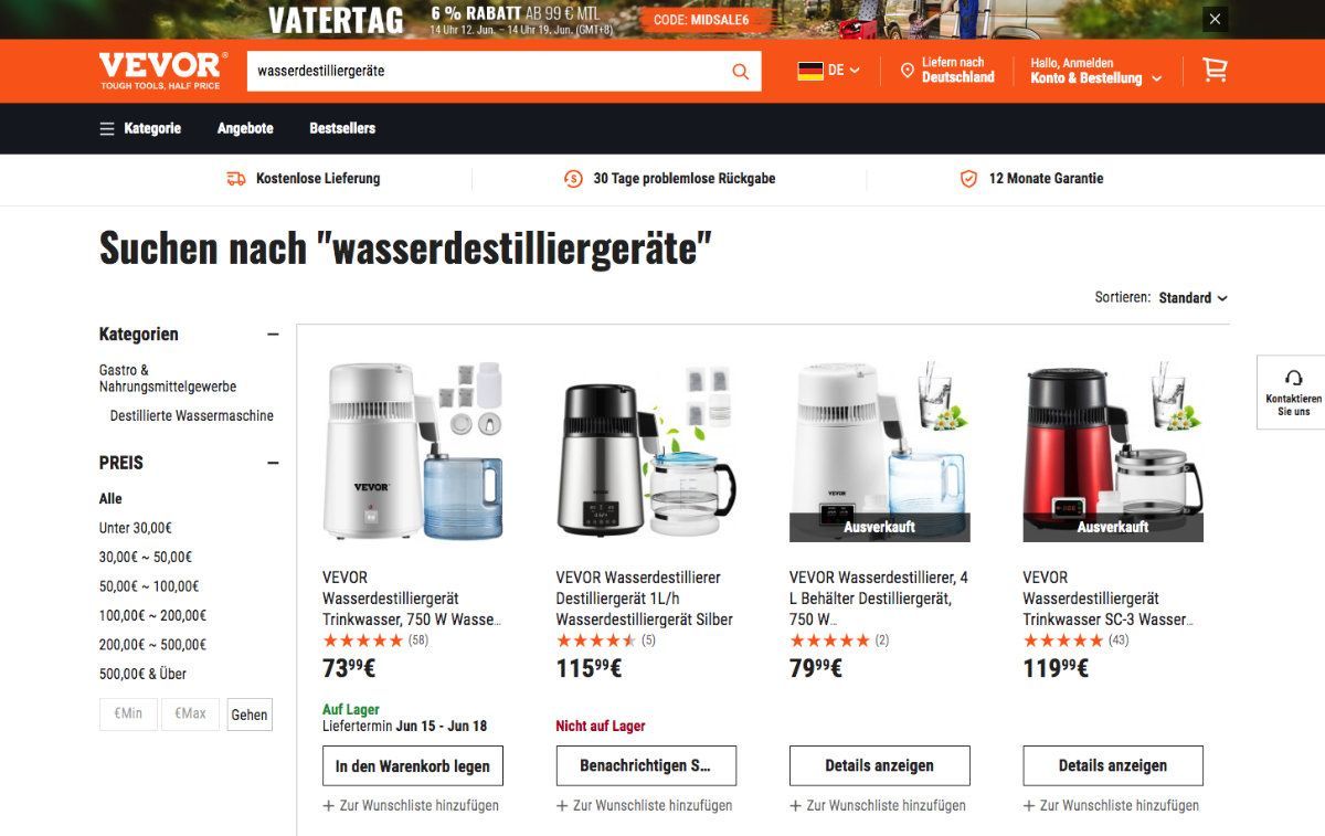 Beim Googeln nach Wasserdestilliergeräten bin ich auf diesen Anbieter hier gestossen: VEVOR – Tough Tools, Half Price; den kannte ich noch nicht. Natürlich wurden mir in der Suchergenisliste zunächst die Angebote von Amazon angezeigt. Ich kaufe da schon seit langem nichts mehr, weil ich diese Firma nicht mehr unterstützen möchte. Später, in einem neuen Artikel mehr dazu. Also bin ich nun froh einen neuen Anbieter gefunden zu haben.